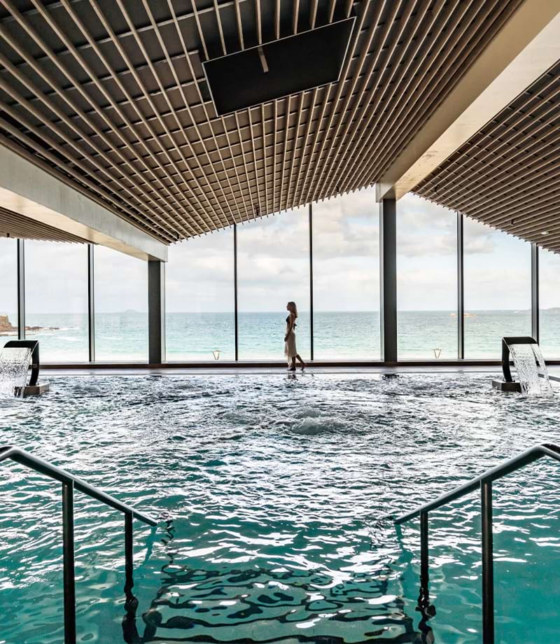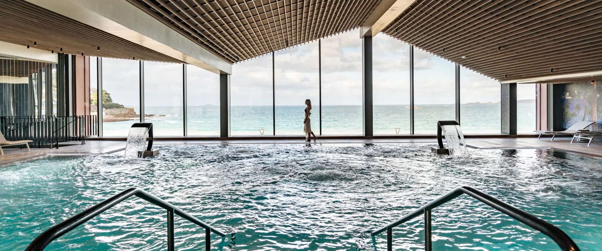 Véritable oasis de sérénité, l’espace SPA et bien-être du Domaine du Liziec s'articule autour d’une piscine pensée comme un cocon minéral. Ses jeux de lumière, inspirés des courants marins du Golfe du Morbihan, invitent à une profonde relaxation.